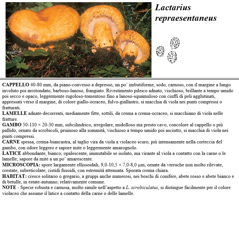 CAPPELLO 40-80 mm, da piano-convesso a depresso, un po' imbutiforme, sodo, camoso, con il margine a lungo involuto poi arrotondato, barboso-lanoso, frangiato. Rivestimento pileico adnato, cischioso, brillante a tempo umido poi secco e opaco, leggermente rugoloso-tomentoso fino a lanoso-squamuloso con ciuffi di peli agglutinati, appressati verso il margine, di colore giallo-ocraceo, fulvo-giallastro, si macchia di viola nei punti compressi o fratturati. LAMELLE adnate-decorrenti, mediamente fitte, sottili, da crema a crema-ocraceo, si macchiano di viola nelle fratture. GAMBO 50-110 x 20-30 mm, subcilindrico, irregolare, midolloso ma presto cavo, concolore al cappello o più pallido, ornato da scrobicoli, pruinoso alla sommità, vischioso a tempo umido poi asciutto, si macchia di viola nei punti compressi. CARNE spessa, crema-biancastra, al taglio vira da viola a violaceo scuro, più intensamente nella corteccia del gambo, con odore leggero e sapore mite o leggermente amarognolo. LATTICE abbondante, bianco, opalescente, immutabile se isolato, ma virante al viola a contatto con la carne o le lamelle, sapore da mite a un po' amarescente. MICROSCOPIA spore largamente ellissoidali, 9,0-10,5 x 7,0-8,0 µm, ornate da verruche non molto rilevate, crestate, subreticolate, cistidi fusoidi, con estremità attenuata. Sporata crema chiara. HABITAT cresce solitario o gregario, a gruppi anche numerosi, nei boschi di conifere, abete rosso e abete bianco e di betulle, in estate-autunno, relativamente comune. NOTE - Specie robusta e carnosa, molto simile nell'aspetto a L. scrobiculatus, si distingue facilmente per il colore violaceo che assume il lattice a contatto della carne o delle lamelle.