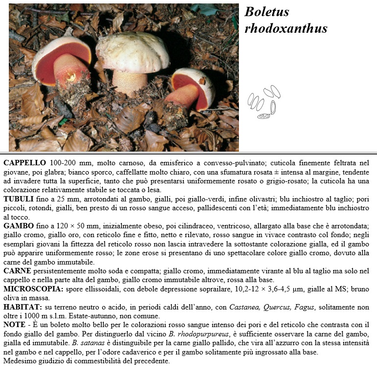 CAPPELLO 100-200 mm, molto carnoso, da emisferico a convesso-pulvinato, cuticola finemente feltrata nel giovane, poi glabra, bianco sporco, caffellatte molto chiaro, con una sfumatura rosata, intensa al margine, tendente ad invadere tutta la superficie, tanto che può presentarsi uniformemente rosato o grigio-rosato, la cuticola ha una colorazione relativamente stabile se toccata o lesa. TUBULI fino a 25 mm, arrotondati al gambo, gialli, poi giallo-verdi, infine olivastri, blu inchiostro al taglio, pori piccoli, rotondi, gialli, ben presto di un rosso sangue acceso, pallidescenti con l'età, immediatamente blu inchiostro al tocco. GAMBO fino a 120 X50 mm, inizialmente obeso, poi cilindraceo, centricoso, allargato alla base che è arrotondata, giallo cromo, giallo oro, con reticolo fine e fitto, netto e rilevato, rosso sangue in vivace contrasto col fondo, negli esemplari giovani la fittezza del reticolo rosso non lascia intravedere la sottostante colorazione gialla, ed il gambo può apparire uniformemente rosso, le zone erose si presentano di uno spettacolare colore giallo cromo, dovuto alla carne del gambo immutabile. CARNE persistentemente molto soda e compatta, giallo cromo, immediatamente virante al blu al taglio ma solo nel cappello e nella parte alta del gambo, giallo cromo immutabile altrove, rossa alla base. MICROSCOPIA spore ellissoidali, con debole depressione soprailare, 10,2-12 x 3,6-4,5 µm, gialle al MS, bruno oliva in massa. HABITAT su terreno neutro o acido, in periodi caldi dell'anno, con Castanea, Quercus, Fagus, solitamente non oltre i 1000 m s.l.m. Estate-autunno, non comune. NOTE - È un boleto molto bello per le colorazioni rosso sangue intenso dei pori e del reticolo che contrasta con il fondo giallo del gambo. Per distinguerlo dal vicino B. rhodopureus, è sufficiente osservare la carne del gambo, gialla ed immutabile. B. satanas è distinguibile per la came giallo pallido, che vira all'azzurro con la stessa intensità nel gambo e nel cappello, per l'odore cadaverico e per il gambo solitamente più ingrossato alla base. Medesimo giudizio di commestibilità del precedente.