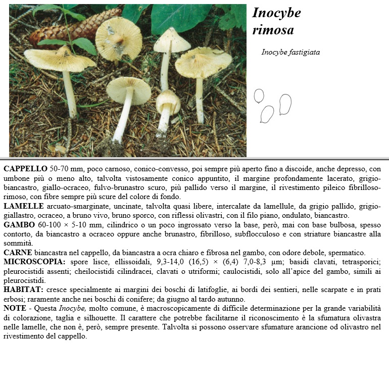CAPPELLO 50-70 mm, poco carnoso, conico-convesso, poi sempre più aperto fino a discoide, anche depresso, con umbone più o meno alto, talvolta vistosamente conico appuntito, il margine profondamente lacerato, grigio-biancastro, giallo-ocraceo, fulvo-brunastro scuro, più pallido verso il margine, il rivestimento pileico fibrilloso-rimoso, con fibre sempre più scure del colore di fondo. LAMELLE arcuato-smarginate, uncinate, talvolta quasi libere, intercalate da lamellule, da grigio pallido, grigio-giallastro, ocraceo, a bruno vivo, bruno sporco, con riflessi olivastri, con il filo piano, ondulato, biancastro. GAMBO 60-100 x 5-10 mm, cilindrico o un poco ingrossato verso la base, però, mai con base bulbosa, spesso contorto, da biancastro a ocraceo oppure anche brunastro, fibrilloso, subflocculoso e con striature biancastre alla sommità. CARNE biancastra nel cappello, da biancastra a ocra chiaro e fibrosa nel gambo, con odore debole, spermatico. MICROSCOPIA spore lisce, ellissoidali, 9,3-14,0 (16,5) x (6,4) 7,0-8,3 µm, basidi clavati, tetrasporici, pleurocistidi assenti, cheilocistidi cilindracei, clavati o utriformi, caulocistidi, solo all'apice del gambo, simili ai pleurocistidi. HABITAT cresce specialmente ai margini dei boschi di latifoglie, ai bordi dei sentieri, nelle scarpate e in prati erbosi, raramente anche nei boschi di conifere, da giugno al tardo autunno. NOTE - Questa Inocybe, molto comune, è macroscopicamente di difficile determinazione per la grande variabilità di colorazione, taglia e silhouette. Il carattere che potrebbe facilitarne il riconoscimento è la sfumatura olivastra nelle lamelle, che non è, però, sempre presente. Talvolta si possono osservare sfumature arancione od olivastro nel rivestimento del cappello.