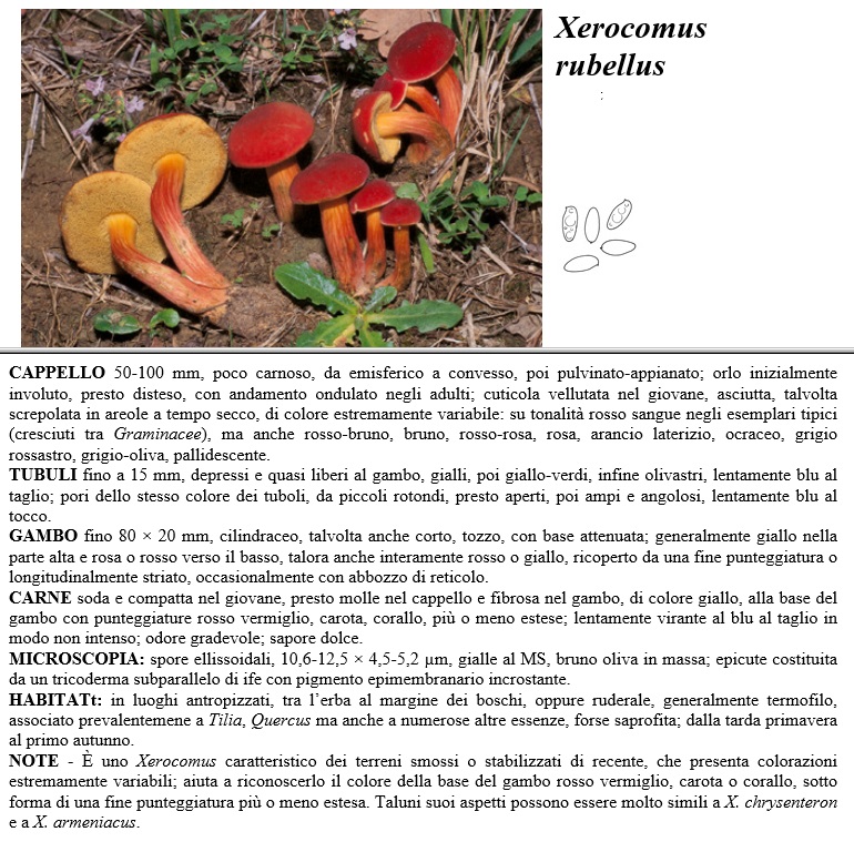 CAPPELLO 50-100 mm, poco carnoso, da emisferico a convesso, poi pulvinato-appianato, orlo inizialmente involuto, presto disteso, con andamento ondulato negli adulti, cuticola vellutata nel giovane, asciutta, talvolta screpolata in areole a tempo secco, di colore estremamente variabile, su tonalità rosso sangue negli esemplari tipici (cresciuti tra Graminacee), ma anche rosso-bruno, bruno, rosso-rosa; rosa, arancio laterizio, ocraceo, grigio rossastro, grigio-oliva pallidescente. TUBULI fino, a 15 mm, depressi e quasi liberi al gambo, gialli, poi giallo-verdi, infine olivastri, lentamente blu al taglio, pori dello stesso colore dei tuboli, da piccoli rotondi, presto aperti, poi ampi e angolosi, lentamente blu al tocco. GAMBO fino 80 x 20 mm, cilindraceo, talvolta anche corto, tozzo, con base attenuata, generalmente giallo nella parte alta e rosa o rosso verso il basso, talora anche interamente rosso o giallo, ricoperto da una fine punteggiatura o longitudinalmente striato, occasionalmente con abbozzo di reticolo. CARNE soda e compatta nel giovane, presto molle nel cappello e fibrosa nel gambo, di colore giallo, alla base del gambo con punteggiature rosso vermiglio, carota, corallo, più o meno estese, lentamente virante al blu al taglio in modo non intenso, odore gradevole, sapore dolce. MICROSCOPIA spore ellissoidali, 10,6-12,5 x 4,5-5,2 µm, gialle al MS, bruno oliva in massa, epicute costituita da un tricoderma subparallelo di ife con pigmento epimembranario incrostante. HABITAT in luoghi antropizzati, tra l'erba al margine dei boschi, oppure ruderale, generalmente termofilo, associato prevalentemene a Tilia, Quercia ma anche a numerose altre essenze, forse saprofita, dalla tarda primavera al primo autunno. NOTE - E uno Xerocomus caratteristico dei terreni smossi o stabilizzati di recente, che presenta colorazioni estremamente variabili, aiuta a riconoscerlo il colore della base del gambo rosso cermiglio, carota o corallo, sotto forma di una fine punteggiatura più o meno estesa. Taluni suoi aspetti possono essere molto simili a X. chrysenteron e a X. armeniacus.