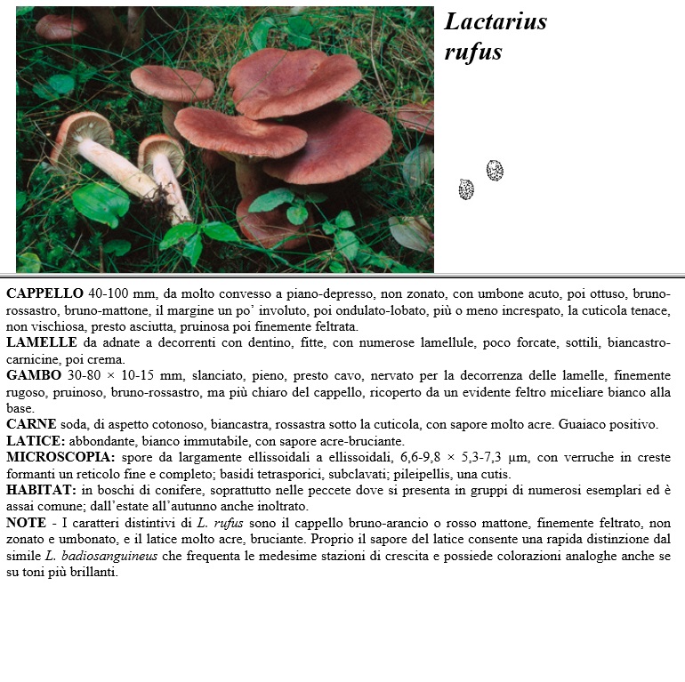 CAPPELLO 40-100 mm, da molto convesso a piano-depresso, non zonato, con umbone acuto, poi ottuso, bruno-rossastro, bruno-mattone, il margine un po' involuto, poi ondulato-lobato, più o meno increspato, la cuticola tenace, non vischiosa, presto asciutta pruinosa poi finemente feltrata. LAMELLE da adnate a decorrenti con dentino, fitte, con numerose lamellule, poco forcate, sottili, biancastro-carnicine, poi crema. GAMBO 30-30 x 10-15 mm, slanciato, pieno, presto caco, nervato per la decorrenza delle lamelle, finemente rugoso, pruinoso, bruno-rossastro, ma più chiaro del cappello, ricoperto da un evidente feltro miceliare bianco alla base. CARNE soda, di aspetto cotonoso, biancastra rossastra sotto la cuticola, con sapore molto acre. Guaiaco positivo. LATTICE: abbondante, bianco immutabile, con sapore acre-bruciante. MICROSCOPIA spore da largamente ellissoidali a ellissoidali, 6,6-9,8 x 5,3-7,3 µm, con verruche in creste formanti un reticolo fine e completo, basidi tetrasporici, subclavati, pileipellis, una cutis. HABITAT in boschi di conifere, soprattutto nelle peccete dove si presenta in gruppi di numerosi esemplari ed è assai comune, dall'estate all'autunno anche inoltrato. NOTE - I caratteri distintivi di L. rufus sono il cappello bruno-arancio o rosso mattone, finemente feltrato, non zonato e umbonato, e il lattice molto acre, bruciante. Proprio il sapore del lattice consente una rapida distinzione dal simile L. badiosanguineus che frequenta le medesime stazioni di crescita e possiede colorazioni analoghe anche se su toni più brillanti.