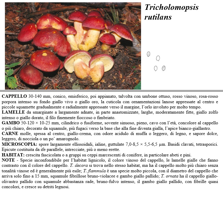 CAPPELLO 30-140 mm, conico, emisferico, poi appianato; talvolta con umbone ottuso, rosso vinoso, rosa-rosso porpora intenso su fondo giallo vivo o giallo oro, la cuticola con ornamentazioni lanose appressate al centro e piccole squamette gradualmente e radialmente appressate verso il margine, l'orlo involuto per molto tempo. LAMELLE da smarginate a largamente adnate, in parte anastomizzate, larghe; moderatamente fitte, giallo zolfo intenso o giallo dorato, il filo finemente fioccoso o funbriato. GAMBO 50-120 x 10-25 mm; cilindrico o fusiforme; sovente sinuoso; pieno, cavo con l'età concolore al cappello o più chiaro, decorato da squamule; più fugaci verso la base che alla fine diventa gialla, l'apice bianco-giallastro. CARNE molle, spessa al centro; giallo-crema con odore acidulo di muffa o leggero, di legno, e sapore dolce; leggero; di nocciola o un po' amarognolo. MICROSCOPIA spore largamente ellissoidali; ialine, guttulate 7,0-8,5 x 5,5-6,5 µm. Basidi clacati; tetrasporici. Epicute costituita da ife parallele, intrecciate, più o meno erette. HABITAT crescita fascicolata o a gruppi su ceppi marcescenti di conifere, in particolare abeti e pini. NOTE - Specie inconfondibile per l'habitat lignicolo; il colore vinoso del cappello, le lamelle gialle che fanno contrasto con il colore del cappello. T. decora si trova nello stesso habitat, ma ha il cappello molto più chiaro senza tonalità vinose ed è generalmente più esile; T. flammula è una specie molto piccola, con il diametro del cappello che arriva solo fino a 15 mm; squamule fibrillose bruno-violacee e gambo giallo pallido; T. ornata ha il cappello giallo-olivastro pallido con squamule abbastanza rade, bruno-fulvo intenso, il gambo giallo pallido; con fibrille quasi concolori, e cresce su detriti legnosi.