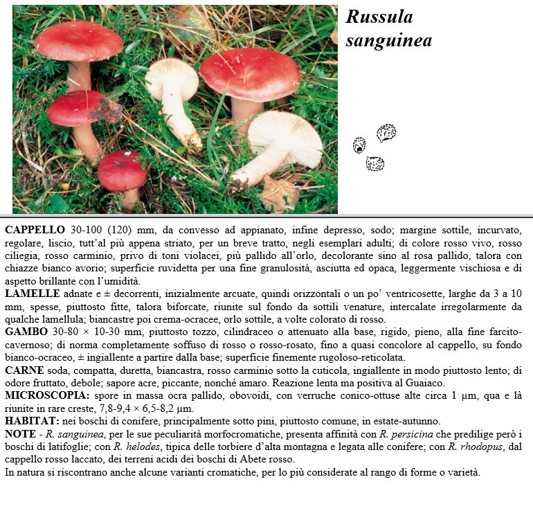 CAPPELLO 30-100 (120) mm; da convesso ad appianato; infine depresso, sodo; margine sottile, incun-ato, regolare, liscio; tutt'al più appena striato, per un breve tratto, negli esemplari adulti; di colore rosso cico; rosso ciliegia, rosso carminio, privo di toni ciolacei; più pallido alPorlo, decolorante sino al rosa pallido; talora con chiazze bianco avorio: superficie ruvidetta per una fine sranulosità; asciutta ed opaca, leggermente vischiosa e di aspetto brillante con l'umidità. LAMELLE adnate e- decorrenti, inizialmente arcuate, quindi orizzontali o un po' ventricosette, larghe da 3 a 10 mm, spesse, piuttosto fitte, talora biforcate, riunite sul fondo da sottili venature, intercalate irregolarmente da qualche lamellula; biancastre poi crema-ocracee, orlo sottile, a volte colorato di rosso. GAMBO 30-80 x 10-30 mm, piuttosto tozzo, cilindraceo o attenuato alla base, rigido, pieno, alla fine farcito¬cavernoso: di norma completamente soffuso di rosso o rosso-rosato, fino a quasi concolore al cappello; su fondo bianco-ocraceo, più o meno ingiallente a partire dalla base; superficie finemente rugoloso-reticolata. CARNE soda, compatta, duretta, biancastra; rosso carminio sotto la cuticola; ingiallente in modo piuttosto lento; di odore fruttato, debole; sapore acre, piccante, nonché amaro. Reazione lenta ma positiva al Guaiaco. MICROSCOPIA spore in massa ocra pallido; obovoidi, con verruche conico-ottuse alte circa 1 µm; qua e là riunite in rare creste, 7,8-9,4 x 6,5-8,2 µm. HABITAT: nei boschi di conifere, principalmente sotto pini; piuttosto comune, in estate-autunno. NOTE - R. sanguinea; per le sue peculiarità morfocromahche, presenta affinità con R. persicina che predilige però i boschi di latifoglie; con R. helodes, tipica delle torbiere d'alta montagna e legata alle conifere; con R. rhodopus, dal cappello rosso laccato, dei terreni acidi dei boschi di Abete rosso. In natura si riscontrano anche alcune varianti cromatiche, per lo più considerate al rango di forme o varietà