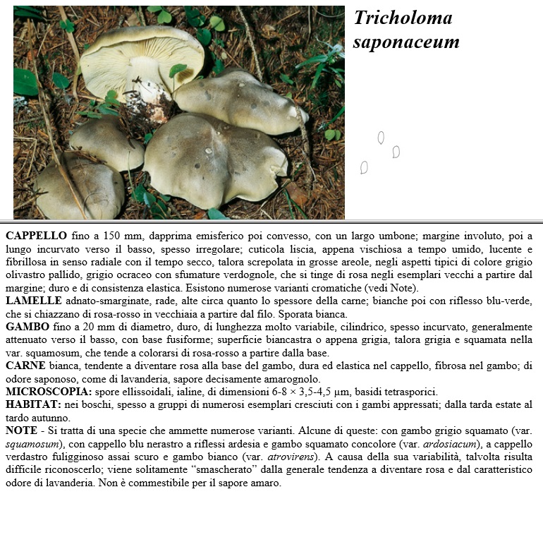 CAPPELLO fino a 150 mm, dapprima emisferico poi convesso, con un largo umbone; margine involuto, poi a lungo incurvato verso il basso, spesso irregolare; cuticola liscia, appena vischiosa a tempo umido, lucente e fibrillosa in senso radiale con il tempo secco, talora screpolata in grosse areole, negli aspetti tipici di colore grigio olivastro pallido, grigio ocraceo con sfumature verdognole, che si tinge di rosa negli esemplari vecchi a partire dal margine; duro e di consistenza elastica. Esistono numerose varianti cromatiche (vedi Note). LAMELLE adnato-smarginate, rade, alte circa quanto lo spessore della carne; bianche poi con riflesso blu-verde, che si chiazzano di rosa-rosso in vecchiaia a partire dal filo. Sporata bianca. GAMBO fino a 20 mm di diametro, duro, di lunghezza molto variabile, cilindrico, spesso incun-ato; generalmente attenuato verso il basso; con base fusiforme; superficie biancastra o appena grigia; talora grigia e squamata nella car. squamosum, che tende a colorarsi di rosa-rosso a partire dalla base. CARNE bianca, tendente a diventare rosa alla base del gambo; dura ed elastica nel cappello, fibrosa nel gambo; di odore saponoso, come di lavanderia, sapore decisamente amarognolo. MICROSCOPIA spore ellissoidali, ialine, di dimensioni 6-8 x 3,5-4,5 µm, basidi tetrasporici. HABITAT nei boschi; spesso a gruppi di numerosi esemplari cresciuti con i gambi appressati; dalla tarda estate al tardo autunno. NOTE - Si tratta di una specie che ammette numerose varianti. Alcune di queste: con gambo grigio squamato (var. squamosum), con cappello blu nerastro a riflessi ardesia e gambo squamato concolore (car. ardosiacum), a cappello verdastro fuligginoso assai scuro e gambo bianco (var. atrovirens). A causa della sua variabilità, talvolta risulta difficile riconoscerlo: viene solitamente "smascherato" dalla generale tendenza a diventare rosa e dal caratteristico odore di lavanderia. Non è commestibile per il sapore amaro.