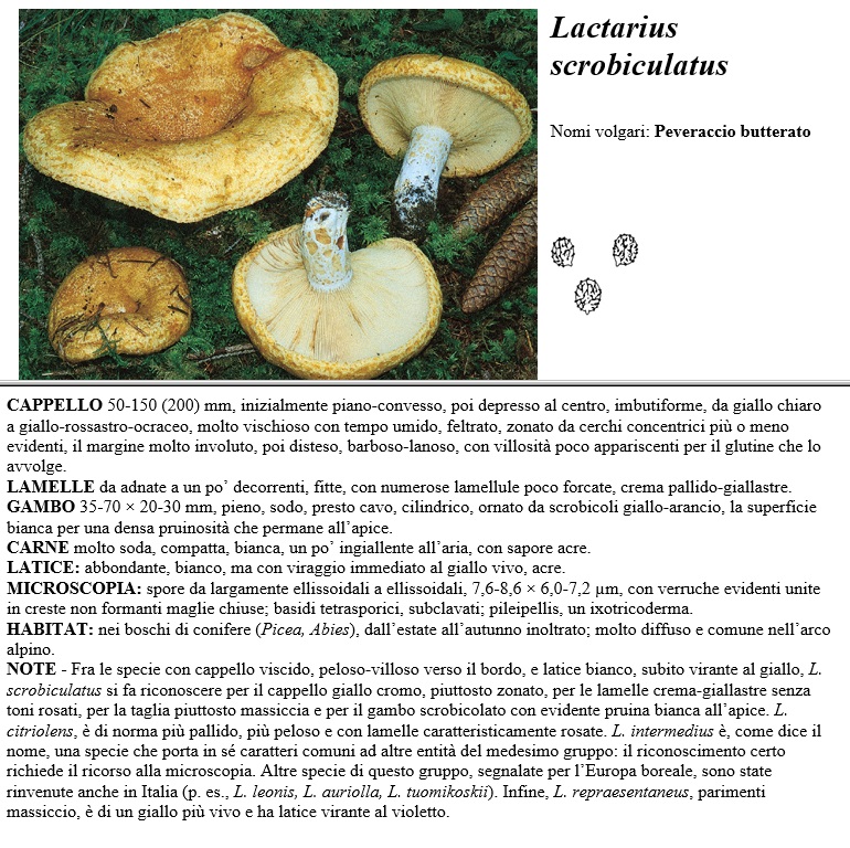 CAPPELLO 50-150 (200) mm, inizialmente piano-convesso, poi depresso al centro, imbutiforme, da giallo chiaro a giallo-rossastro-ocraceo, molto vischioso con tempo umido, feltrato, zonato da cerchi concentrici più o meno evidenti, il margine molto involuto, poi disteso, barboso-lanoso, con villosità poco appariscenti per il glutine che lo avvolge. LAMELLE da adnate a un po' decorrenti, fitte, con numerose lamellule poco forcate, crema pallido-giallastre. GAMBO 35-70 x 20-30 mm, pieno, sodo, presto cavo, cilindrico, ornato da scrobicoli giallo-arancio, la superficie bianca per una densa pruinosità che permane all'apice. CARNE molto soda compatta, bianca, un po' ingiallente all'aria, con sapore acre. LATTICE abbondante, bianco, ma con viraggio immediato al giallo vivo, acre. MICROSCOPIA spore da largamente ellissoidali a ellissoidali, 7,6-8,6 x 6,0-7,2 µm, con verruche evidenti unite in creste non formanti maglie chiuse, basidi teuasporici, subclavati, pileipellis, un ixotricoderma. HABITAT nei boschi di conifere (Picea, Abies), dall'estate all'autunno inoltrato, molto diffuso e comune nell'arco alpino. NOTE - Fra le specie con cappello viscido, peloso-villoso verso il bordo, e lattice bianco, subito virante al giallo, L. scrobiculatus si fa riconoscere per il cappello giallo cromo, piuttosto zonato, per le lamelle crema-giallastre senza toni rosati, per la taglia piuttosto massiccia e per il gambo scrobicolato con evidente pruina bianca all'apice. L. citriolens, è di norma più pallido, più peloso e con lamelle caratteristicamente rosate. L. intermedius è, come dice il nome, una specie che porta in sé caratteri comuni ad altre entità del medesimo gruppo: il riconoscimento certo richiede il ricorso alla microscopia. Altre specie di questo gruppo, segnalate per l'Europa boreale, sono state rinvenute anche in Italia (L. leonis, L. auriolla, L. tuomikoskii). Infine, L. repraesentaneus, parimenti massiccio, è di un giallo più vivo e ha lattice virante al violetto.
