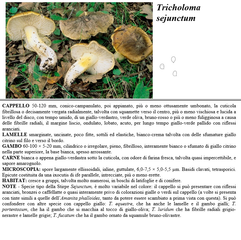 CAPPELLO 50-120 mm; conico-campanulato, poi appianato, più o meno ottusamente umbonato; la cuticola fibrillosa o decisamente vergata radialmente; talvolta con squamette verso il centro, più o meno vischiosa e lucida a livello del disco, con tempo umido, di un giallo-verdastro; verde oliva, bruno-rosso o più o meno fuligginosa a causa delle fibrille radiali, il margine liscio, ondulato, lobato; acuto, per lungo tempo giallo-verde pallido con riflessi aranciati. LAMELLE smarginate, uncinate, poco fitte, sottili ed elastiche, bianco-crema talvolta con delle sfumature giallo citrino sul filo e verso il bordo. GAMBO 60-100 x 5-20 mm; cilindrico o irregolare, pieno, fibrilloso, interamente bianco o sfumato di giallo citrino nella parte superiore, la base bianca, spesso arrossante. CARNE bianca o appena giallo-verdastra sotto la cuticola, con odore di farina fresca, talvolta quasi impercettibile, e sapore amarognolo. MICROSCOPIA spore largamente ellissoidali; ialine, guttulate; 6,0-7,5 x 5,0-5,5 µm. Basidi clavati, tetrasporici. Epicute costituita da una ixocutis di ife parallele, intrecciate, più o meno erette. HABITAT cresce a gruppi; talvolta molto numerosi, in boschi di latifoglie e di conifere. NOTE - Specie tipo della Stirpe Sejunctum, è molto variabile nel colore: il cappello si può presentare con riflessi aranciati, bronzei o caffellatte o quasi interamente privo di colorazioni gialle o verdi sul cappello (a volte si presenta con tinte simili a quelle dell'Amanita phalloides; tanto da potere essere scambiato a prima vista con questa). Si può confondere con altre specie con cappello giallo: T. equestre; che ha anche le lamelle e il gambo gialli; T. portentosum; che ha il gambo che si macchia al tocco di giallo-oliva; T. luridum che ha fibrille radiali grigio-nerastre e lamelle grigie: T.fucatum che ha il gambo ornato da squamule bruno-olivastre.