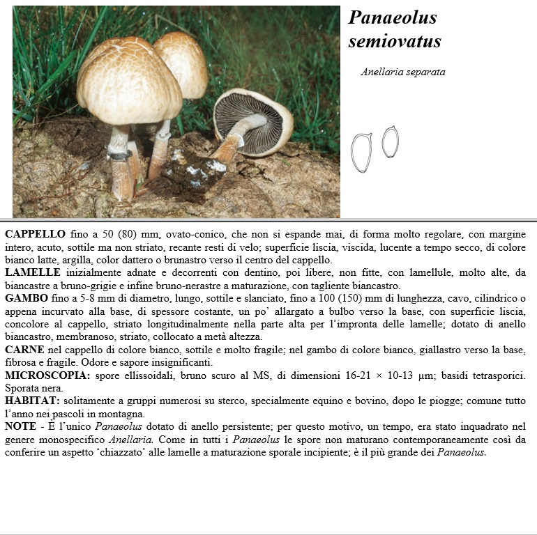 CAPPELLO fino a 50 (80) mm, ovato-conico, che non si espande mai, di forma molto regolare, con margine intero, acuto, sottile ma non striato, recante resti di velo, superficie liscia, viscida, lucente a tempo secco, di colore bianco latte, argilla, color dattero o brunastro verso il centro del cappello. LAMELLE inizialmente adnate e decorrenti con dentino, poi libere, non fitte, con lamellule, molto alte, da biancastre a bruno-grigie e infine bruno-nerastre a maturazione, con tagliente biancastro. GAMBO fino a5-8 mm di diametro, lungo, sottile e slanciato, fino a 100 (150) mm di lunghezza, cavo, cilindrico o appena incurvato alla base, di spessore costante, un po' allargato a bulbo verso la base, con superficie liscia, concolore al cappello, striato longitudinalmente nella parte alta per l'impronta delle lamelle, dotato di anello biancastro, membranoso, striato, collocato a metà altezza. CARNE nel cappello di colore bianco, sottile e molto fragile, nel gambo di colore bianco, giallastro verso la base, fibrosa e fragile. Odore e sapore insignificanti. MICROSCOPIA spore ellissoidali, bruno scuro al MS, di dimensioni 16-21 x 10-13 µm, basidi tetrasporici. Sporata nera. HABITAT solitamente a gruppi numerosi su sterco, specialmente equino e bovino, dopo le piogge, comune tutto l'anno nei pascoli in montagna. NOTE - E' l'unico Panaeolus dotato di anello persistente, per questo motivo, un tempo, era stato inquadrato nel genere monospecifico Anellaria. Come in tutti i Panaeolus le spore non maturano contemporaneamente così da conferire un aspetto "chiazzato" alle lamelle a maturazione sporale incipiente, è il più grande dei Panaeolus.