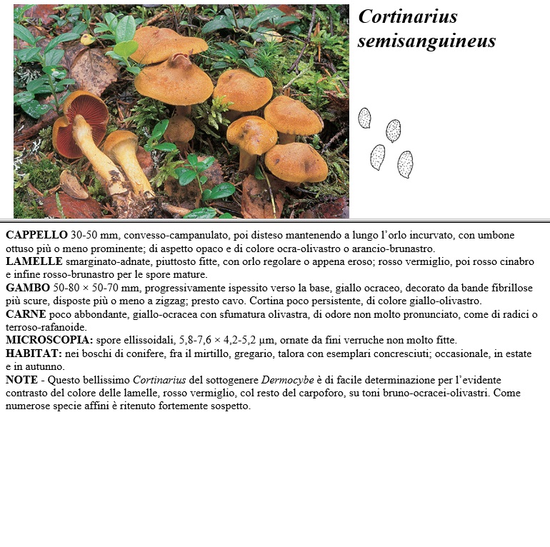 CAPPELLO 30-50 mm, convesso-campanulato, poi disteso mantenendo a lungo l'orlo incurvato, con umbone ottuso più o meno prominente, di aspetto opaco e di colore ocra-olivastro o arancio-brunastro. LAMELLE smarginato-adnate, piuttosto fitte, con orlo regolare o appena eroso, rosso vermiglio, poi rosso cinabro e infine rosso-brunastro per le spore mature. GAMBO 50-80 x 50-70 mm, progressivamente ispessito verso la base, giallo ocraceo, decorato da bande fibrillose più scure, disposte più o meno a zigzag, presto cavo. Cortina poco persistente, di colore giallo-olivastro. CARNE poco abbondante, giallo-ocracea con sfumatura olivastra, di odore non molto pronunciato, come di radici o terroso-rafanoide. MICROSCOPIA spore ellissoidali, 5,8-7,6 x 4,2-5,2 µm, ornate da fini verruche non molto fitte. HABITAT nei boschi di conifere, fra il mirtillo, gregario, talora con esemplari concresciuti, occasionale, in estate e in autunno. NOTE - Questo bellissimo Cortinarius del sottogenere Dermocybe è di facile determinazione per l'evidente contrasto del colore delle lamelle, rosso vermiglio, col resto del carpoforo, su toni bruno-ocracei-olivastri. Come numerose specie affini è ritenuto fortemente sospetto