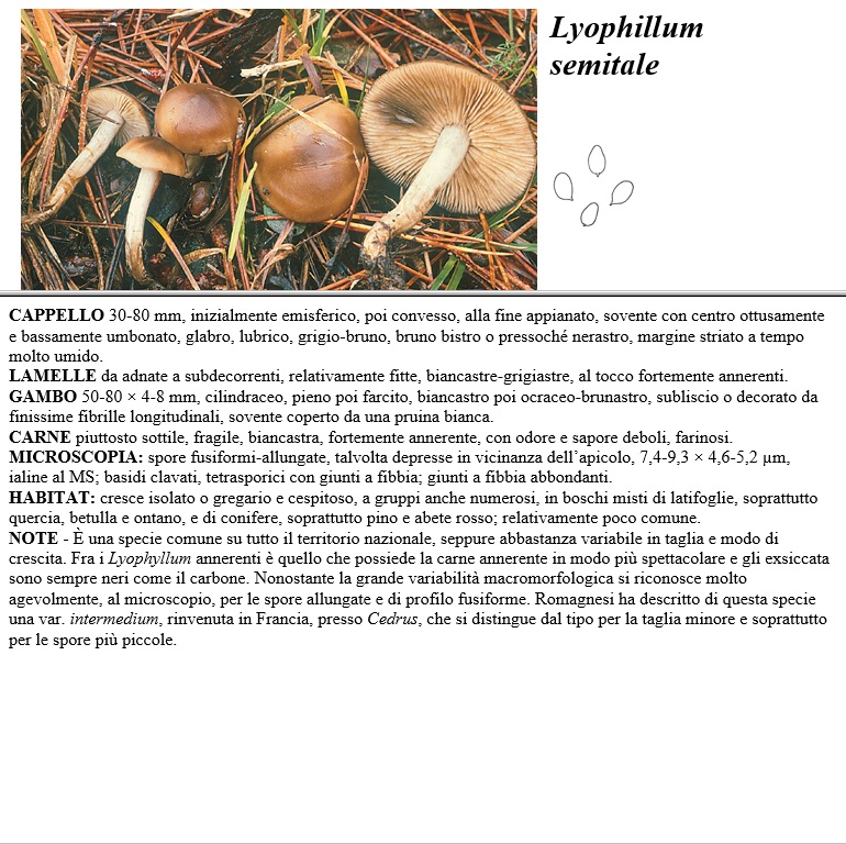 CAPPELLO 30-80 mm, inizialmente emisferico, poi convesso, alla fine appianato, sovente con centro ottusamente e bassamente umbonato, glabro, lubrico, origio-bruno, bruno bistro o pressoché nerastro, margine striato a tempo molto umido. LAMELLE da adnate a subdecorrenti, relativamente fitte, biancastre-grigiastre, al tocco fortemente annerenti. GAMBO 50-80 x 4-8 mm, cilindraceo, pieno poi farcito, biancastro poi ocraceo-brunastro, subliscio o decorato da finissime fibrille longitudinali, sovente coperto da una pruina bianca. CARNE piuttosto sottile, fragile, biancastra, fortemente annerente, con odore e sapore deboli, farinosi. MICROSCOPIA spore fusiformi-allungate, talvolta depresse in vicinanza dell'apicolo, 7,4-9,3 x 4,6-5,2 µm, ialine al MS, basidi clavati, tetrasporici con giunti a fibbia, giunti a fibbia abbondanti. HABITAT: cresce isolato o gregario e cespitoso, a gruppi anche numerosi, in boschi misti di latifoglie, soprattutto quercia, betulla e ontano, e di conifere, soprattutto pino e abete rosso, relativamente poco comune. NOTE - E una specie comune su tutto il territorio nazionale, seppure abbastanza variabile in taglia e modo di crescita. Fra i Lyophyllum annerenti è quello che possiede la carne annerente in modo più spettacolare e gli exsiccata sono sempre neri come il carbone. Nonostante la grande variabilità macromorfologica si riconosce molto agevolmente, al microscopio, per le spore allungate e di profilo fusiforme. Romagnesi ha descritto di questa specie una var. intermedium, rinvenuta in Francia, presso Cedro, che si distingue dal tipo per la taglia minore e soprattutto per le spore più piccole.