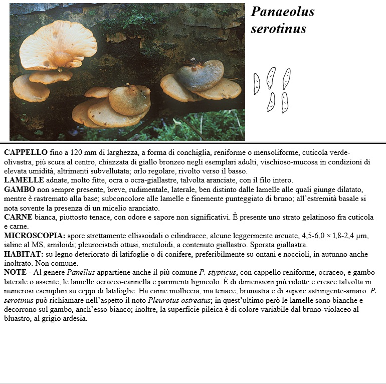 CAPPELLO fino a 120 mm di larghezza, a forma di conchiglia, reniforme o mensoliforme, cuticola verde-olicastra, più scura al centro, chiazzata di giallo bronzeo negli esemplari adulti, vischioso-mucosa in condizioni di elevata umidità. altrimenti subvellutata, orlo regolare, rivolto verso il basso. LAMELLE adnate, molto fitte, ocra o ocra-giallastre, talvolta aranciate, con il filo intero. GAMBO non sempre presente, breve, rudimentale, laterale, ben distinto dalle lamelle alle quali giunge dilatato, mentre è rastremato alla base, subconcolore alle lamelle e finemente punteggiato di bruno, all'estremità basale si nota sovente la presenza di un micelio aranciato. CARNE bianca, piuttosto tenace, con odore e sapore non significativi. E presente uno strato gelatinoso fra cuticola e carne. MICROSCOPIA spore strettamente ellissoidali o cilindracee, alcune leggermente arcuate, 4,5-6,0 x 1,8-2,4 um, ialine al MS, amiloidi, pleurocistidi ottusi, metuloidi, a contenuto giallastro. Sporata giallastra. HABITAT su legno deteriorato di latifoglie o di conifere, preferibilmente su ontani e noccioli, in autunno anche inoltrato. Non comune. NOTE - Al genere Panellus appartiene anche il più comune P. stypticus, con cappello reniforme, ocraceo, e gambo laterale o assente, le lamelle ocraceo-cannella e parimenti lignicolo. E di dimensioni più ridotte e cresce talvolta in numerosi esemplari su ceppi di latifoglie. Ha carne molliccia, ma tenace, brunastra e di sapore astringente-amaro. P. serotinus può richiamare nell'aspetto il noto Pleurotus ostreatus, in quest'ultimo però le lamelle sono bianche e decorrono sul gambo, anch'esso bianco, inoltre, la superficie pileica è di colore variabile dal bruno-violaceo al bluastro, al grigio ardesia.
