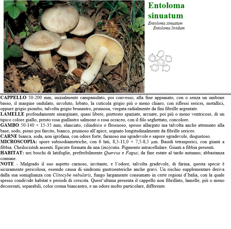 CAPPELLO 50-200 tmn, mizialmence campanulato, poi convesso, alla fine appianato, con o senza un umbone basso, il margine ondulato, involuto, lobato, la cuticola grigio più o meno chiaro, con riflessi sericei, metallici, oppure grigio piombo, talvolta grigio brunastro, pruinosa, vergata radialmente da fini fibrille argentate. LAMELLE profondamente smarginate, quasi libere, piuttosto spaziate, arcuate, poi più o meno ventricose, di un tipico colore giallo, presto rosa giallastro salmone o rosa ocraceo, con il filo seghettato, concolore. GAMBO 50-140 - 15-35 mm, slanciato, cilindrico o flessuoso, spesso allargato ma talvolta anche attenuato alla base, sodo, pieno poi farcito, bianco, pruinoso all'apice, segnato longitudinalmente da fibrille sericee. CARNE bianca, soda, non igrofana, con odore forte, farinoso ma sgradevole e sapore sgradevole, disgustoso. MICROSCOPIA spore subisodiametriche, con 6 lati, 8,5-11,0 x 7,5-8,5 µm. Basidi tetrasporici, con giunti a fibbia. Cheilocistidi assenti. Epicute formata da una ixocutis. Pigmento intracellulare. Giunti a fibbia presenti. HABITAT nei boschi di latifoglie, preferibilmente Quercus e Faous, da fine estate al tardo autunno, abbastanza comune. NOTE - Malgrado il suo aspetto carnoso, invitante, e l'odore, talvolta gradevole, di farina, questa specie è sicuramente pericolosa, essendo causa di sindromi gastroenteriche anche gravi. Un rischio supplementare deriva dalla sua somiglianza con Clitocybe nebularis, fungo largamente consumato in certe regioni d'Italia, con la quale spesso condivide habitat e periodi di crescita. Quest'ultima presenta il cappello non fibrillato, lamelle, più o meno decorrenti, separabili, color crema biancastro, e un odore molto particolare, differente.
