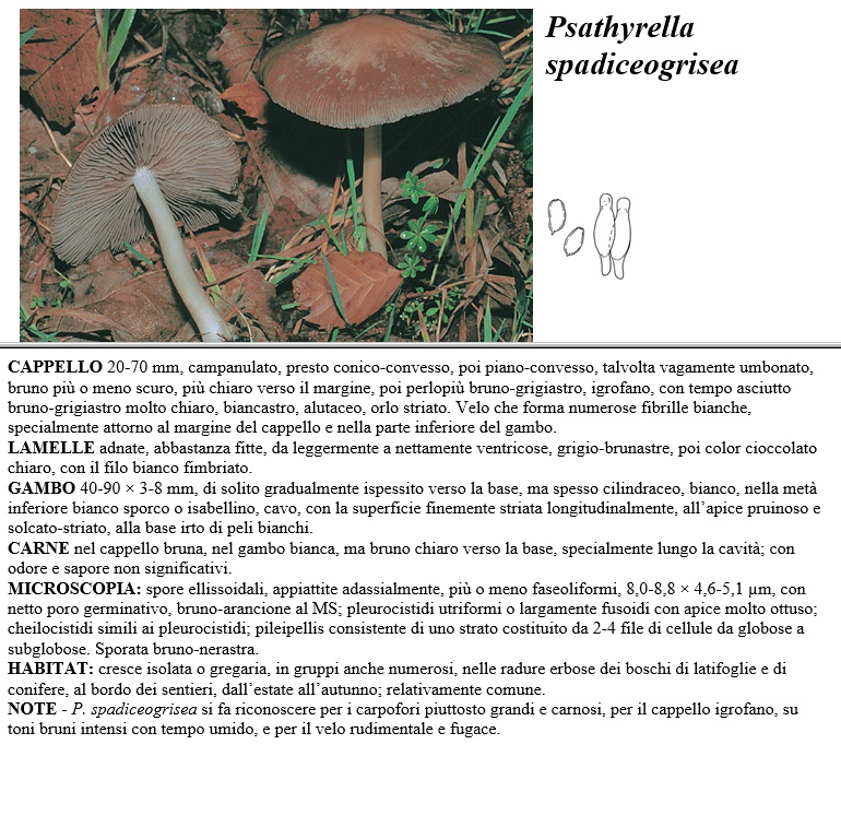 CAPPELLO 20-70 mm, campanulato; presto conico-convesso, poi piano-convesso, talvolta vagamente umbonato. bruno più o meno scuro; più chiaro verso il margine; poi perlopiù bruno-grigiastro, igrofano, con tempo asciutto bruno-erieiastro molto chiaro, biancastro. alutaceo, orlo striato. Velo che forma numerose fibrille bianche, specialmente attorno al margine del cappello e nella parte inferiore del gambo. LAMELLE adnate, abbastanza fitte, da leggermente a nettamente centricose; grigio-brunastre; poi color cioccolato chiaro, con il filo bianco funbriato. GAMBO 40-90 x 3-8 mm, di solito gradualmente ispessito verso la base, ma spesso cilindraceo; bianco, nella metà inferiore bianco sporco o isabellino, cavo, con la superficie finemente striata longitudinalmente; all'apice pruinoso e solcato-striato, alla base irto di peli bianchi. CARNE nel cappello bruna; nel gambo bianca, ma bruno chiaro verso la base, specialmente lungo la cavità: con odore e sapore non significativi. MICROSCOPIA spore ellissoidali, appiattite adassialmente; più o meno faseoliformi, 8,0-8,8 x-4;6-5;1 µm; con netto poro germinativo; bruno-arancione al MS: pleurocistidi utrìformi o largamente fusoidi con apice molto ottuso; cheilocistìdi simili ai pleurocistidi; pileipellis consistente di uno strato costituito da 2-4 file di cellule da globose a subglobose. Sporata bruno-nerastra. HABITAT cresce isolata o gregaria; in gruppi anche numerosi, nelle radure erbose dei boschi di latifoglie e di conifere, al bordo dei sentieri. dall'estate all'autunno: relativamente comune. NOTE - P. spadiceogrisea si fa riconoscere per i carpofori piuttosto grandi e carnosi, per il cappello igrofano, su tom bruni intensi con tempo umido, e per il velo rudimentale e fugace.
