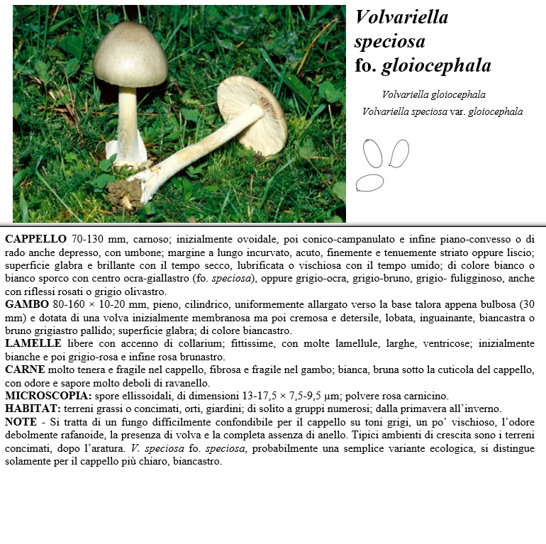 CAPPELLO 70-130 mm, carnoso; inizialmente ovoidale, poi conico-campanulato e infine piano-convesso o di rado anche depresso, con umbone; margine a lungo incure-ato, acuto, finemente e tenuemente striato oppure liscio; superficie glabra e brillante con il tempo secco, lubrificata o vischiosa con il tempo umido; di colore bianco o bianco sporco con centro ocra-giallastro (fo. speciosa), oppure grigio-ocra, grigio-bruno, grigio- fuligginoso, anche con riflessi rosati o grigio olivastro. GAMBO 80-160 x 10-20 mm; pieno, cilindrico, uniformemente allargato verso la base talora appena bulbosa (30 mm) e dotata di una volva inizialmente membranosa ma poi cremosa e detersile, lobata; inguainante, biancastra o bruno grigiastro pallido; superficie glabra: di colore biancastro. LAMELLE libere con accenno di collarium; flttissime; con molte lamellule; larghe; ventricose; inizialmente bianche e poi grigio-rosa e infine rosa brunastra. CARNE molto tenera e fragile nel cappello, fibrosa e fragile nel gambo; bianca, bruna sotto la cuticola del cappello, con odore e sapore molto deboli di ravanello. MICROSCOPIA spore ellissoidali; di dimensioni 13-17,5 x 7,5-9,5 µm; polvere rosa carnicino. HABITAT terreni grassi o concimati, orti; giardini; di solito a gruppi numerosi; dalla primavera all'inverno. NOTE - Si tratta di un fungo difficilmente confondibile per il cappello su toni grigi, un po' vischioso, l'odore debolmente rafanoide; la presenza di volva e la completa assenza di anello. Tipici ambienti di crescita sono i terreni concimati, dopo l'aratura. P speciosa fo. speciosa, probabilmente una semplice variante ecologica, si distingue solamente per il cappello più chiaro, biancastro.