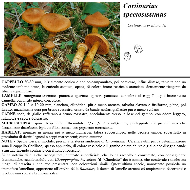 CAPPELLO 30-80 mm, inizialmenteconico o conico-campanulato, poi convesso, infine disteso, talvolta con un evidente umbone acuto, la cuticola asciutta, opaca, di colore bruno rossiccio aranciato, densamente ricoperta da fibrille squamulose. LAMELLE smarginato-uncinate, piuttosto spaziate, spesse, panciute, concolori al cappello, poi bruno-rosso cannella, con il filo intero, concolore. GAMBO 80-140 x 10-20 mm, slanciato, cilindrico, più o meno arcuato, talvolta clavato o fusiforme, pieno, poi farcito, inizialmente ocra poi bruno rossastro, ornato da bande anulari giallastre più o meno evidenti. CARNE soda, da giallo zafferano a bruno rossastro, specialmente verso la base del gambo, con odore leggero, rafanoide e sapore dolciastro. MICROSCOPIA spore largamente ellissoidali, 9,5-11,5 x 7,2-8,4 µm, punteggiate da piccole verruche densamente distribuite. Epicute filamentosa, con pigmento incrostante. HABITAT gregario in gruppi più o meno numerosi, talora subcespitoso, nelle peccete umide, soparttutto in prossimità di detriti legnosi o ceppi marcescenti, estate-autunno. NOTE - Specie tossica, mortale, presenta la stessa sindrome di C. orellanus. Caratteri utili per la determinazione sono il cappello fibrilloso, spesso appuntito, di colore rossiccio e il gambo ornato dal velo giallo che disegna bande a zie zag facendo contrasto con il fondo rossiccio. Si ha notizia di qualche raccoglitore, piuttosto superficiale, che lo ha raccolto e consumato, con conseguenze drammatiche, scambiandolo con Chroogomphus helveticus (il "Chiodetto" dei trentini), che condivide i medesimi luoghi di crescita e che può presentarsi con colorazioni simili. Quest'ultima specie, nonostante possieda un imenoforo lamellato, appartiene all'ordine delle Boletales, è dotata di lamelle arcuate ed ampiamente decorrenti e produce una sporata bruno-nerastra.
