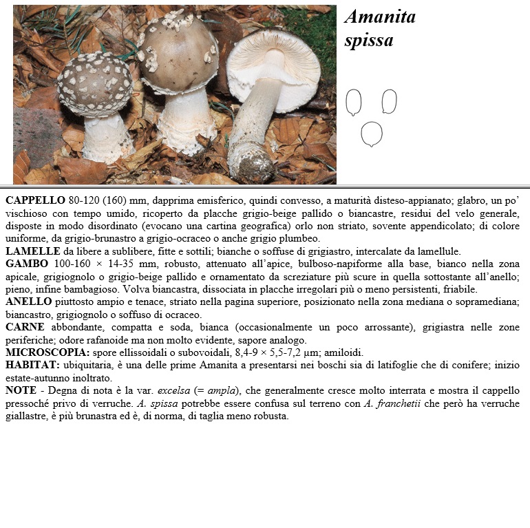 CAPPELLO 80-120 (160) mm, dapprima emisferico, quindi convesso, a maturità disteso-appianato, glabro, un po' vischioso con tempo umido, ricoperto da placche grigio-beige pallido o biancastre, residui del velo generale, disposte in modo disordinato (evocano una cartina geografica) orlo non striato, sovente appendicolato, di colore uniforme, da grigio-brunastro a grigio-ocraceo o anche grigio plumbeo. LAMELLE da libere a sublibere, fitte e sottili, bianche o soffuse di grigiastro, intercalate da lamellule. GAMBO 100-160 x 14-35 mm, robusto, attenuato all'apice, bulboso-napiforme alla base, bianco nella zona apicale, grigiognolo o grigio-beige pallido e ornamentato da screziature più scure in quella sottostante all'anello, pieno, infine bambagioso. VOLVA biancastra, dissociata in placche irregolari più o meno persistenti, friabile. ANELLO piuttosto ampio e tenace, striato nella pagina superiore, posizionato nella zona mediana o sopramediana; biancastro, grigiognolo o soffuso di ocraceo. CARNE abbondante, compatta e soda, bianca (occasionalmente un poco arrossante), grigiastra nelle zone periferiche, odore rafanoide ma non molto evidente, sapore analogo. MICROSCOPIA spore ellissoidali o subovoidali, 8,4-9 X5,5-7,2 µm, amiloidi. HABITAT ubiquitaria, è una delle prime Amanita a presentarsi nei boschi sia di latifoglie che di conifere, inizio estate-autunno inoltrato. NOTE - Degna di nota è la var. excelsa (= ampla), che generalmente cresce molto interrata e mostra il cappello pressoché privo di verruche. A. spissa potrebbe essere confusa sul terreno con A. franchetii che però ha verruche giallastre, è più brunastra ed è, di norma, di taglia meno robusta.