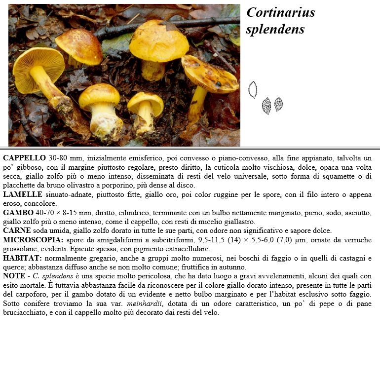 CAPPELLO 30-80 mm, inizialmente emisferico, poi convesso o piano-convesso, alla fine appianato, talvolta un po' gibboso, con il margine piuttosto regolare, presto diritto, la cuticola molto vischiosa dolce, opaca una volta secca, giallo zolfo più o meno intenso, disseminata di resti del velo universale, sotto forma di squamette o di placchette da bruno olivastro a porporino, più dense al disco. LAMELLE sinuato-adnate, piuttosto fitte, giallo oro, poi color ruggine per le spore, con il filo intero o appena eroso.concolore. GAMBO 40-70 x 8-15 mm, diritto, cilindrico, terminante con un bulbo nettamente marginato, pieno, sodo, asciutto, giallo zolfo più o meno intenso, come il cappello, con resti di micelio giallastro. CARNE soda umida, giallo zolfo dorato in tutte le sue parti, con odore non significativo e sapore dolce. MICROSCOPIA spore da amigdaliformi a subcitriformi, 9,5-11,5 (14) x 5,5-6,0 (7,0) µm, ornate da verruche grossolane, evidenti. Epicute spessa, con pigmento extracellulare. HABITAT normalmente gregario, anche a gruppi molto numerosi, nei boschi di faggio o in quelli di castagni e querce, abbastanza diffuso anche se non molto comune, fruttifica in autunno. NOTE - C. splendens è una specie molto pericolosa, che ha dato luogo a gravi avvelenamenti, alcuni dei quali con esito mortale. È tuttavia abbastanza facile da riconoscere per il colore giallo dorato intenso, presente in tutte le parti del carpoforo, per il gambo dotato di un evidente e netto bulbo marginato e per l'habitat esclusivo sotto faggio. Sotto conifere troviamo la sua var. meinhardii, dotata di un odore caratteristico, un po' di pepe o di pane bruciacchiato, e con il cappello molto più decorato dai resti del velo.