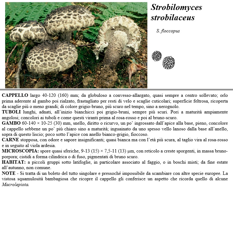 CAPPELLO largo 40-120 (160) mm, da globuloso a concesso-allargato, quasi sempre a centro sollevato, orlo prima aderente al gambo poi rialzato, frastagliato per resti di velo e scaglie cuticolari, superficie feltrosa. ricoperta da scaglie più o meno grandi, di colore grigio-bruno, più scuro nel tempo, sino a nerognolo. TUBOLI lunghi, adnati, all'inizio bianchicci poi grigio-bruni, sempre più scuri. Pori a maturità ampiamente angolosi, concolori ai tuboli e come questi viranti prima al rosa-rosso e poi al bruno-scuro. GAMBO 60-140 x 10-25 (30) mm, snello, diritto o ricurvo, un po' ingrossato dall'apice alla base, pieno, concolore al cappello sebbene un po' più chiaro sino a maturità, inguainato da uno spesso vello lanoso dalla base all'anello, sopra di questo liscio, poco sotto l'apice con anello bianco-grigio, fioccoso. CARNE stopposa, con odore e sapore insignificanti, quasi bianca ma con 1' età più scura, al taglio vira al rosa-rosso e in seguito al viola ardesia. MICROSCOPIA spore quasi sferiche, 9-13 (15) x 7,5-11 (13) µm, con reticolo a creste sporgenti, in massa bruno-porpora, cistidi a forma cilindrica o di fuso, pigmentati di bruno scuro. HABITAT a piccoli gruppi sotto latifoglie, in particolare associato al faggio, o in boschi misti, da fine estate all'autunno, non comune. NOTE - Si tratta di un boleto del tutto singolare e pressoché impossibile da scambiare con altre specie europee. La vistosa squamulosità bambagiosa che ricopre il cappello gli conferisce un aspetto che ricorda quello di alcune Macrolepiota.