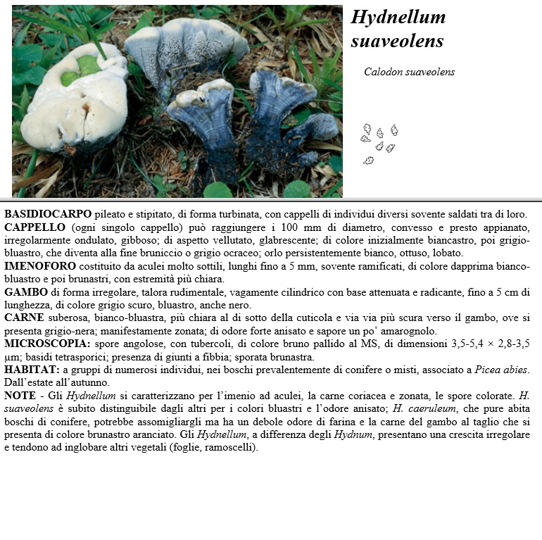 BASIDIOCARPO pileato e stipitato, di forma turbinata, con cappelli di individui diversi sovente saldati tra di loro. CAPPELLO (ogni singolo cappello) può raggiungere i 100 mm di diametro, convesso e presto appianato, irregolarmente ondulato, gibboso, di aspetto vellutato, glabrescente, di colore inizialmente biancastro, poi grigio-bluastro, che diventa alla fine bruniccio o grigio ocraceo, orlo persistentemente bianco, ottuso, lobato. IMENOFORO costituito da aculei molto sottili, lunghi fino a 5 mm, sovente ramificati, di colore dapprima bianco-bluastro e poi brunastri, con estremità più chiara. GAMBO di forma irregolare, talora rudimentale, vagamente cilindrico con base attenuata e radicante, fino a 5 cm di lunghezza. di colore grigio scuro. bluastro. anche nero. CARNE suberosa, bianco-bluastra, più chiara al di sotto della cuticola e via via più scura verso il gambo, ove si presenta grigio-nera, manifestamente zonata, di odore forte anisato e sapore un po' amarognolo. MICROSCOPIA spore angolose, con tubercoli, di colore bruno pallido al MS, di dimensioni 3,5-5,4 x 2,8-3,5 µm, basidi tetrasporici, presenza di giunti a fibbia, sporata brunastra. HABITAT a gruppi di numerosi individui, nei boschi prevalentemente di conifere o misti, associato a Picea abies. Dall'estate all'autunno. NOTE - Gli Hydnellum si caratterizzano per l'imenio ad aculei, la came coriacea e zonata, le spore colorate. H. suaveolens è subito distinguibile dagli altri per i colori bluastri e l'odore anisato; H. caeruleum, che pure abita boschi di conifere, potrebbe assomigliargli ma ha un debole odore di farina e la carne del gambo al taglio che si presenta di colore brunastro aranciato. Gli Hydnellum, a differenza degli Hydnum, presentano una crescita irregolare e tendono ad inglobare altri vegetali (foglie, ramoscelli).