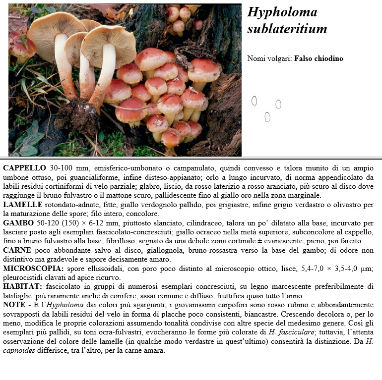 CAPPELLO 30-100 mm, emisferico-umbonato o campanulato, quindi convesso e talora munito di un ampio umbone ottuso, poi guancialiforme, infine disteso-appianato, orlo a lungo incurvato, di norma appendicolato da labili residui cortiniformi di velo parziale, glabro, liscio, da rosso laterizio a rosso aranciato, più scuro al disco dove raggiunge il bruno fulcastro o il mattone scuro, pallidescente fino al giallo oro nella zona marginale. LAMELLE rotondato-adnate, fitte, giallo verdognolo pallido, poi grigiastre, infine grigio verdastro o olivastro per la maturazione delle spore, filo intero, concolore. GAMBO 50-120 (150) x 6-12 mm, piuttosto slanciato, cilindraceo, talora un po' dilatato alla base, incurvato per lasciare posto agli esemplari fascicolato-concresciuti, giallo ocraceo nella metà superiore, subconcolore al cappello, fino a bruno fulvastro alla base, fibrilloso, segnato da una debole zona cortinale più o meno evanescente, pieno, poi farcito. CARNE poco abbondante salvo al disco, giallognola, bruno-rossastra verso la base del gambo, di odore non distintivo ma gradevole e sapore decisamente amaro. MICROSCOPIA spore ellissoidali, con poro poco distinto al microscopio ottico, lisce, 5,4-7,0 x 3,5-4,0 µm, pleurocistidi clavati ad apice ricurvo. HABITAT fascicolato in gruppi di numerosi esemplari concresciuti, su legno marcescente preferibilmente di latifoglie, più raramente anche di conifere, assai comune e diffuso, fruttifica quasi tutto l'anno. NOTE - E' l' Hypholoma dai colori più sgargianti, i giovanissimi carpofori sono rosso rubino e abbondantemente sovrapposti da labili residui del velo in forma di placche poco consistenti, biancastre. Crescendo decolora o, per lo meno, modifica le proprie colorazioni assumendo tonalità condivise con altre specie del medesimo genere. Così gli esemplari più pallidi, su toni ocra-fulvastri, evocheranno le forme più colorate di H. fasciculare, tuttavia, l'attenta osservazione del colore delle lamelle (in qualche modo verdastre in quest'ultimo) consentirà la distinzione. Da H. capnoides differisce, tra l'altro, per la carne amara