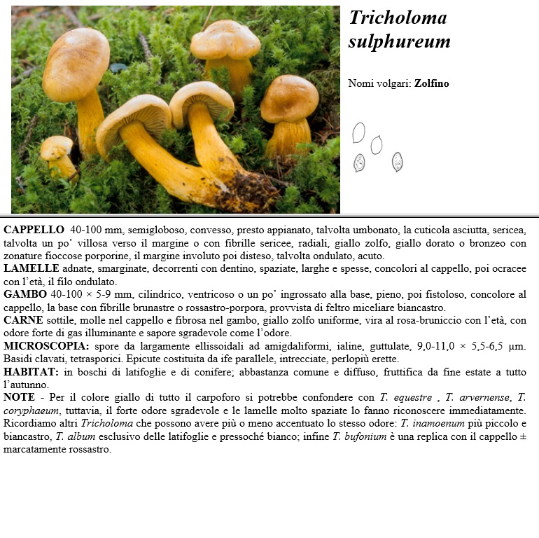 CAPPELLO 40-100 mm, semigloboso; convesso, presto appianato, talvolta umbonato; la cuticola asciutta, sericea; talvolta un po' villosa verso il margine o con fibrille sericee, radiali, giallo zolfo, giallo dorato o bronzeo con zonature fioccose porporine, il margine involuto poi disteso, talvolta ondulato, acuto. LAMELLE adnate; smarginate, decorrenti con dentino, spaziate, larghe e spesse; concolori al cappello; poi ocracee con l'età- il filo ondulato. GAMBO 40-100 x 5-9 mm, cilindrico; ventricoso o un po' ingrossato alla base; pieno; poi fistoloso; concolore al cappello, la base con fibrille brunastre o rossastro-porpora, provvista di feltro miceliare biancastro. CARNE sottile, molle nel cappello e fibrosa nel gambo, giallo zolfo uniforme, vira al rosa-bruniccio con 1"età; con odore forte di gas illuminante e sapore sgradevole come l'odore. MICROSCOPIA spore da largamente ellissoidali ad amigdaliformi, ialine, guttulate, 9,0-11,0 x 5,5-6,5 µm. Basidi clavati, tetrasporici. Epicute costituita da ife parallele; intrecciate, perlopiù erette. HABITAT in boschi di latifoglie e di conifere: abbastanza comune e diffuso, fruttifica da fine estate a tutto l'autunno. NOTE - Per il colore giallo di tutto il carpoforo si potrebbe confondere con T. equestre , T. arvernense, T. caryphaeum; tuttavia, il forte odore sgradevole e le lamelle molto spaziate lo fanno riconoscere immediatamente. Ricordiamo altri Tricholoma che possono avere più o meno accentuato lo stesso odore: T. inamoenum più piccolo e biancastro, T. album esclusivo delle latifoglie e pressoché bianco; infine T. bufonium è una replica con il cappello più o meno marcatarnente rossastro.