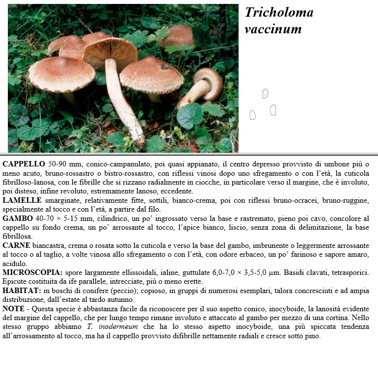 CAPPELLO 50-90 mm; conico-campanulato, poi quasi appianato; il centro depresso provvisto di umbone più o meno acuto, bruno-rossastro o bistro-rossastro; con riflessi vinosi dopo uno sfregamento o con l'età; la cuticola fibrilloso-lanosa, con le fibrille che si rizzano radialmente in ciocche, in particolare verso il margine, che è involuto; poi disteso, infine revoluto, estremamente lanoso, eccedente. LAMELLE smarginate; relativamente fitte, sottili; bianco-crema; poi con riflessi bruno-ocracei, bruno-ruggine; specialmente al tocco e con l'età; a partire dal filo. GAMBO 40-70 x 5-15 mm, cilindrico; un po' ingrossato verso la base e rastremato; pieno poi cavo; concolore al cappello su fondo crema, un po' arrossante al tocco, l'apice bianco, liscio, senza zona di delimitazione, la base fibrillosa. CARNE biancastra, crema o rosata sotto la cuticola e verso la base del gambo; imbrunente o leggermente arrossante al tocco o al taglio, a volte vinosa allo sfregamento o con 1'età, con odore erbaceo; un po' farinoso e sapore amaro; acidulo. MICROSCOPIA spore largamente ellissoidali; ialine, guttulate 6,0-7,0 x 3,5-5,0 µm. Basidi clavati; tetrasporici. Epicute costituita da ife parallele, intrecciate, più o meno erette. HABITAT: in boschi di conifere (peccio); copioso, in gruppi di numerosi esemplari, talora concresciuti e ad ampia distribuzione. dall'estate al tardo autunno. NOTE - Questa specie è abbastanza facile da riconoscere per il suo aspetto conico; inocyboide; la lanosità evidente del margine del cappello, che per lungo tempo rimane involuto e attaccato al gambo per mezzo di una cortina. Nello stesso gruppo abbiamo T. inodermeum che ha lo stesso aspetto inocyboide; una più spiccata tendenza all'arrossamento al tocco, ma ha il cappello provvisto di fibrille nettamente radiali e cresce sotto pino.