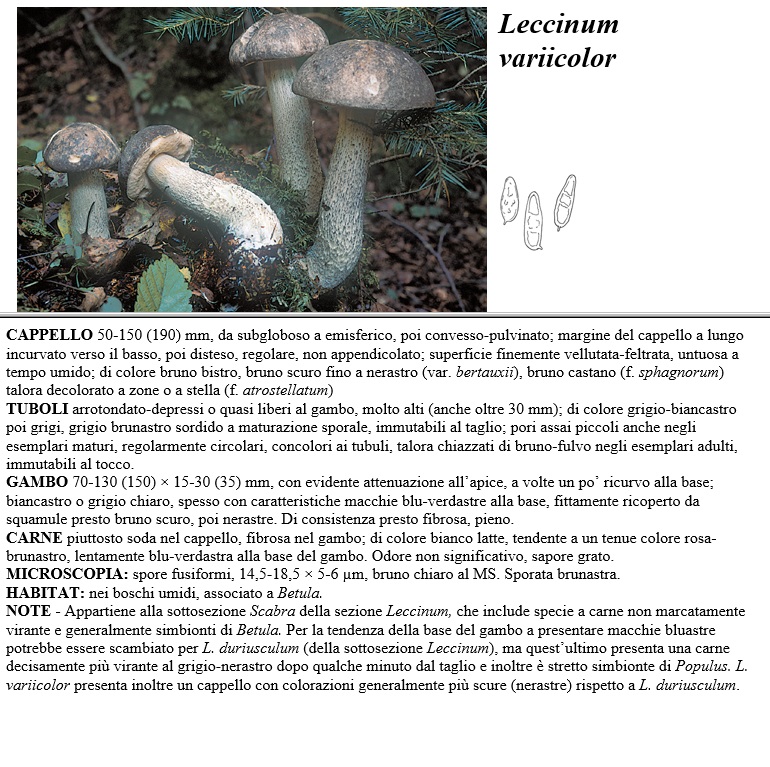 CAPPELLO 50-150 (190) mm, da subgloboso a emisferico, poi convesso-pulvinato, margine del cappello a lungo incurvato verso il basso, poi disteso, regolare, non appendicolato, superficie finemente vellutata-feltrata, untuosa a tempo umido, di colore bruno bistro, bruno scuro fino a nerastro (var. bertauxii), bruno castano (f. sphagnorum) talora decolorato a zone o a stella (f atrostellatun) TUBOLI arrotondato-depressi o quasi liberi al gambo, molto alti (anche oltre 30 mm), di colore grigio-biancastro poi grigi, grigio brunastro sordido a maturazione sporale, immutabili al taglio, pori assai piccoli anche negli esemplari maturi, regolarmente circolari, concolori ai tubuli, talora chiazzati di bruno-fulvo negli esemplari adulti, immutabili al tocco. GAMBO 70-130 (150) x 15-30 (35) mm, con evidente attenuazione all'apice, a volte un po' ricurvo alla base, biancastro o grigio chiaro, spesso con caratteristiche macchie blu-verdastre alla base, fittamente ricoperto da squamule presto bruno scuro, poi nerastre. Di consistenza presto fibrosa, pieno. CARNE piuttosto soda nel cappello, fibrosa nel gambo, di colore bianco latte, tendente a un tenue colore rosa-brunastro, lentamente blu-verdastra alla base del gambo. Odore non significativo, sapore grato. MICROSCOPIA spore fusiformi, 14,5,-13,5 x 5-6 µm, bruno chiaro al MS. Sporata brunastra. HABITAT nei boschi umidi, associato a Benda. NOTE - Appartiene alla sottosezione Scabra della sezione Leccimnn, che include specie a carne non marcatamente virante e generalmente simbionti di Betula. Per la tendenza della base del gambo a presentare macchie bluastre potrebbe essere scambiato per L. duriusculum (della sottosezione Leccinum), ma quest'ultimo presenta una carne decisamente più virante al grigio-nerastro dopo qualche minuto dal taglio e inoltre è stretto simbionte di Populus. L. variicolor presenta inoltre un cappello con colorazioni generalmente più scure (nerastre) rispetto a L. duriusculum.
