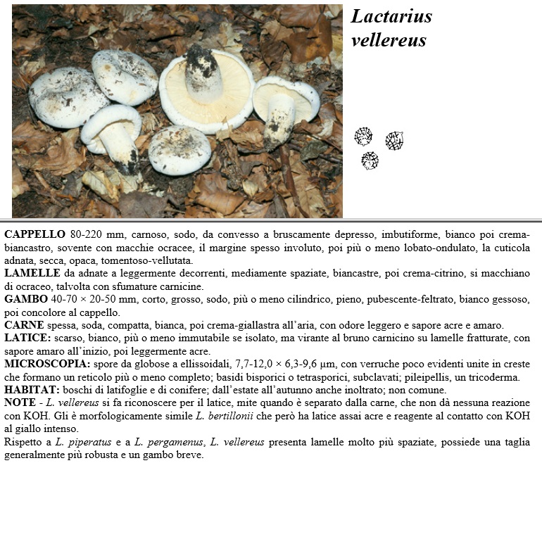 CAPPELLO 80-220 mm, carnoso, sodo, da convesso a bruscamente depresso, imbutiforme, bianco poi crema-biancastro, sovente con macchie ocracee, il margine spesso involuto, poi più o meno lobato-ondulato, la cuticola adnata, secca, opaca, tomentoso-vellutata. LAMELLE da adnate a leggermente decorrenti, mediamente spaziate, biancastre, poi crema-citrino, si macchiano di ocraceo, talvolta con sfumature carnicine. GAMBO 40-70 x 20-50 mm, corto, grosso, sodo, più o meno cilindrico, pieno, pubescente-feltrato, bianco gessoso, poi concolore al cappello. CARNE spessa, soda, compatta, bianca, poi crema-giallastra all'aria, con odore leggero e sapore acre e amaro. LATTICE scarso, bianco, più o meno immutabile se isolato, ma virante al bruno carnicino su lamelle fratturate, con sapore amaro all'inizio, poi leggermente acre. MICROSCOPIA spore da globose a ellissoidali, 7,7-12,0 x 6,3-9,6 µm, con verruche poco evidenti unite in creste che formano un reticolo più o meno completo, basidi bisporici o tetrasponci, subclavati, pileipellis, un tricoderma. HABITAT boschi di latifoglie e di conifere, dall'estate all'autunno anche inoltrato, non comune. NOTE - L. vellereus si fa riconoscere per il lattice, mite quando è separato dalla carne, che non dà nessuna reazione con KOH. Gli è morfologicamente simile L. bertillonii che però ha lattice assai acre e reagente al contatto con KOH al giallo intenso. Rispetto a L. piperatus e a L. pergamenus, L. vellereus presenta lamelle molto più spaziate, possiede una taglia generalmente più robusta e un gambo breve.
