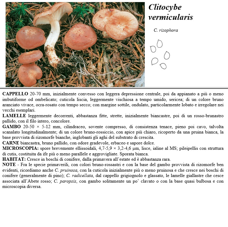 CAPPELLO 20-70 mm, inizialmente convesso con leggera depressione centrale, poi da appianato a più o meno imbutiforme od ombelicato, cuticola liscia, leggermente vischiosa a tempo umido, sericea, di un colore bruno aranciato vivace, ocra-rosato con tempo secco, con margine sottile, ondulato, particolarmente lobato e irregolare nei vecchi esemplari. LAMELLE leggermente decorrenti, abbastanza fitte, strette, inizialmente biancastre, poi di un rosso-brunastro pallido, con il filo intero, concolore. GAMBO 20-50 x 5-12 mm,, cilindraceo, sovente compresso, di consistenza tenace, pieno poi cavo, talvolta scanalato longitudinalmente, di un colore bruno-rossiccio, con apice più chiaro, ricoperto da una pruina bianca, la base provvista di rizomorfe bianche, inglobanti gli aghi del substrato di crescita. CARNE biancastra, bruno pallido, con odore gradevole, erbaceo e sapore dolce. MICROSCOPIA spore brevemente ellissoidali, 4,7-5,9 x 3,2 - 4,6 µm, lisce, ialine al MS, pileipellis con struttura di cutis, costituita da ife più o meno parallele e aggrovigliate. Sporata bianca. HABITAT Cresce in boschi di conifere, dalla primavera all'estate ed è abbastanza rara. NOTE - Fra le specie primaverili, con colori bruno-rossastri e con la base del gambo provvista di rizomorfe ben evidenti, ricordiamo anche C. pruinosa, con la cuticola inizialmente più o meno pruinosa e che cresce nei boschi di conifere (generalmente di pino), C radicellata, dal cappello grigiognolo e glassato, le lamelle giallastre che cesce associata all'Abete rosso, C. paropsis; con gambo solitamente un po' clavato o con la base quasi bulbosa e con microscopia diversa.