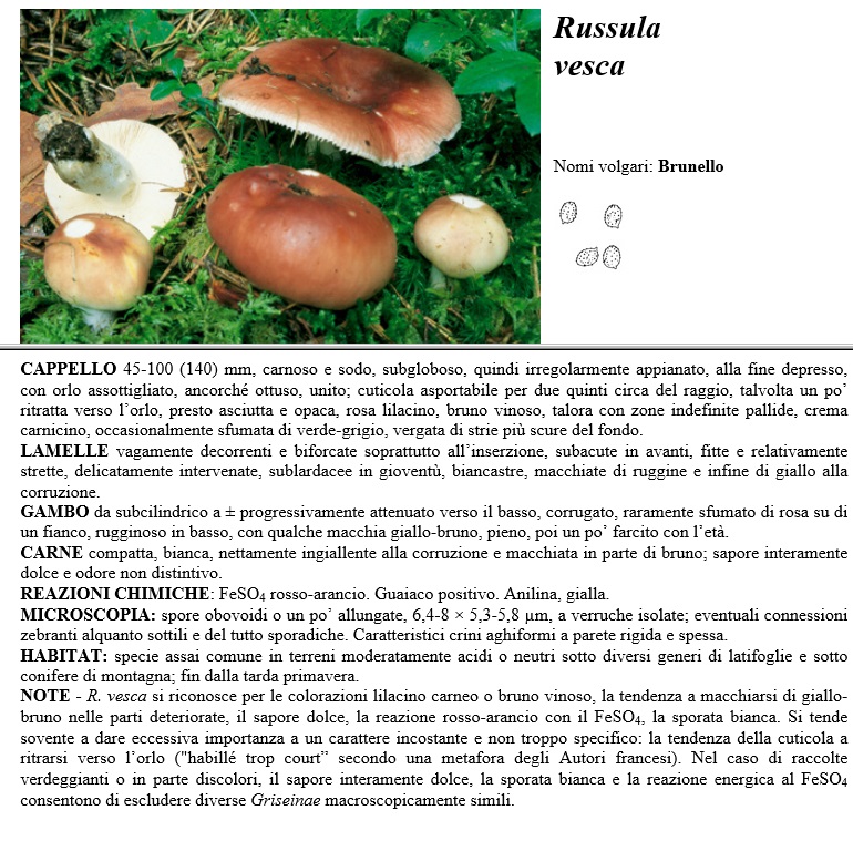 CAPPELLO 45-100 (140) mm, carnoso e sodo; subgloboso, quindi irregolarmente appianato, alla fine depresso, con orlo assotti?liato, ancorché ottuso, unito; cuticola asportabile per due quinti circa del raggio, talvolta un po' ritratta verso l'orlo, presto asciutta e opaca, rosa lilacino, bruno vinoso, talora con zone indefinite pallide, crema carnicino, occasionalmente sfumata di verde-grigio, vergata di strie più scure del fondo. LAMELLE vagamente decorrenti e biforcate soprattutto all'inserzione, subacute in avanti, fitte e relativamente strette, delicatamente inten-enate, sublardacee in giocentù, biancastre, macchiate di ruggine e infine di giallo alla corruzione. GAMBO da subcilindrico a'- progressivamente attenuato verso il basso, corrugato, raramente sfumato di rosa su di un fianco, rugginoso in basso, con qualche macchia giallo-bruno, pieno, poi un po' farcito con l'età. CARNE compatta, bianca, nettamente ingiallente alla corruzione e macchiata in parte di bruno; sapore interamente dolce e odore non distintivo. REAZIONI CHIMICHE FeSO4 rosso-arancio. Guaiaco positivo. Anilina, gialla. MICROSCOPIA spore obovoidi o un po' allungate, 6,4-8 x 5,3-5,8 µm, a verruche isolate; eventuali connessioni zebranti alquanto sottili e del tutto sporadiche. Caratteristici crini aghiformi a parete rigida e spessa. HABITAT specie assai comune in terreni moderatamente acidi o neutri sotto diversi generi di latifoglie e sotto conifere di montagna; fin dalla tarda primavera. NOTE - R. vesca si riconosce per le colorazioni lilacino carneo o bruno vinoso, la tendenza a macchiarsi di giallo-bruno nelle parti deteriorate, il sapore dolce, la reazione rosso-arancio con il FeSO4, la sporata bianca. Si tende sovente a dare eccessiva importanza a un carattere incostante e non troppo specifico: la tendenza della cuticola a ritrarsi verso l'orlo ("habillé trop court" secondo una metafora degli Autori francesi). Nel caso di raccolte verdeggianti o in parte discolori, il sapore interamente dolce, la sporata bianca e la reazione energica al FeSO4 consentono di escludere diverse Griseinae macroscopicamente simili.