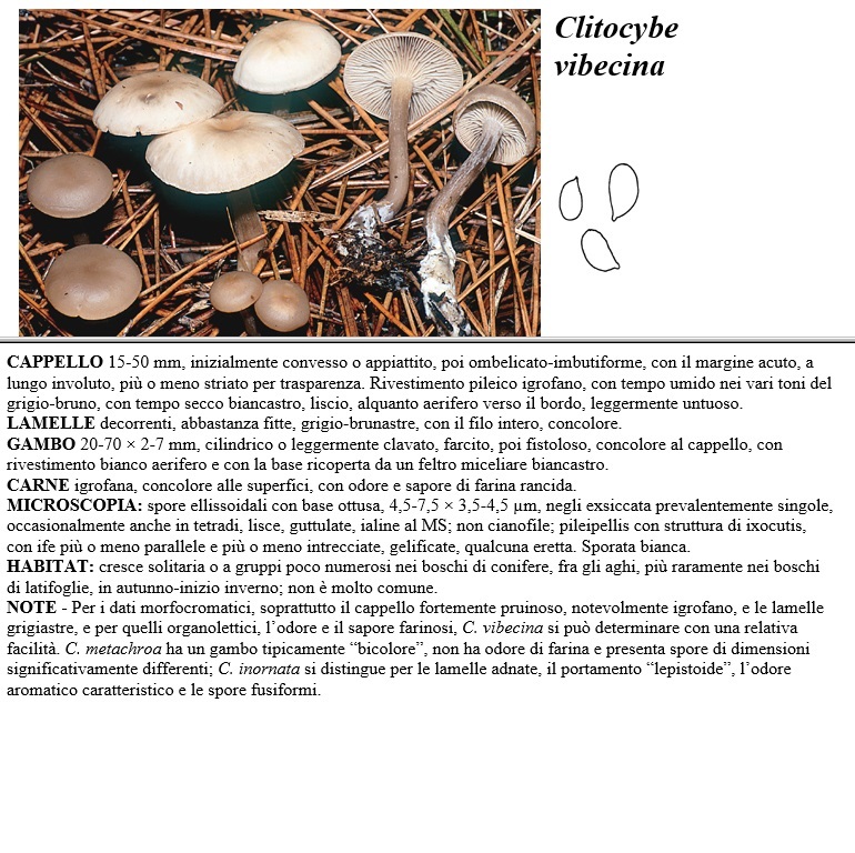 CAPPELLO 15-50 mm, inizialmente convesso o appiattito, poi ombelicato-imbutiforme, con il margine acuto, a lungo involuto, più o meno striato per trasparenza. Rivestimento pileico igrofano, con tempo umido nei vari toni del grigio-bruno, con tempo secco biancastro, liscio, alquanto aerifero verso il bordo, leggermente untuoso. LAMELLE decorrenti, abbastanza fitte, grigio-brunastre, con il filo intero, concolore. GAMBO 20-70 x 2-7 mm, cilindrico o leggermente clacato, farcito, poi fistoloso, concolore al cappello, con rivestimento bianco aerifero e con la base ricoperta da un feltro miceliare biancastro. CARNE isrofana, concolore alle superfici, con odore e sapore di farina rancida. MICROSCOPIA spore ellissoidali con base ottusa, 4,5-7,5 x 3,5-4,5 um, negli exsiccata prevalentemente singole, occasionalmente anche in tetradi, lisce, guttulate, ialine al MS, non cianofile, pileipellis con struttura di ixocutis, con ife più o meno parallele e più o meno intrecciate, gelificate, qualcuna eretta. Sporata bianca. HABITAT cresce solitaria o a gruppi poco numerosi nei boschi di conifere, fra gli aghi, più raramente nei boschi di latifoglie, in autunno-inizio inverno, non è molto comune. NOTE - Per i dati morfocromatia, soprattutto il cappello fortemente pruinoso, notevolmente igrofano, e le lamelle grìgiastre, e per quelli organolettici, l'odore e il sapore farinosi, C. vibecina si può determinare con una relativa facilità. C. metachroa ha un gambo tipicamente "bicolore", non ha odore di farina e presenta spore di dimensioni significativamente differenti, C. inornata si distingue per le lamelle adnate, il portamento "Lepistoide", l'odore aromatico caratteristico e le spore fusiformi.
