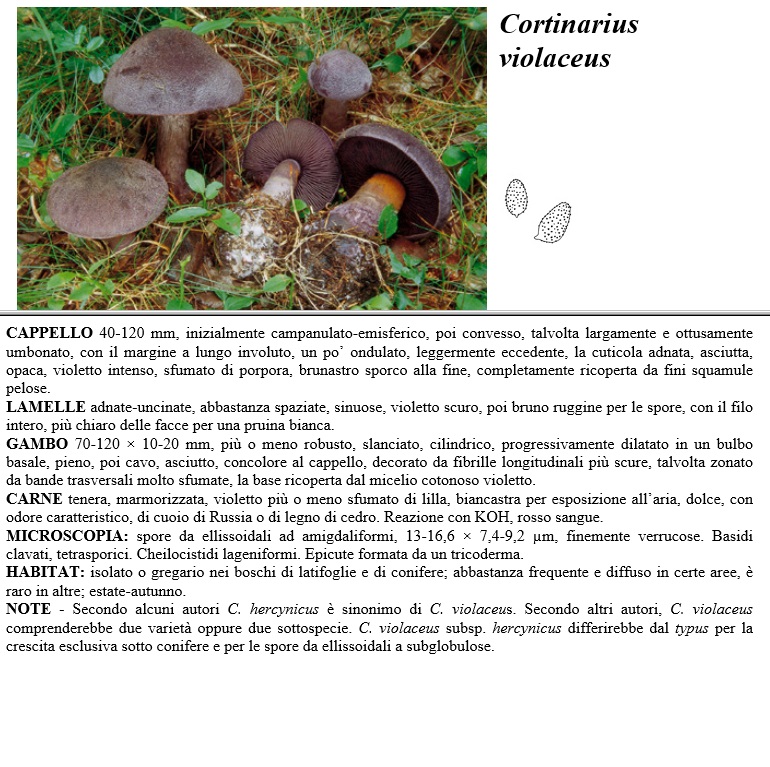 CAPPELLO 40-120 mm, inizialmente campanulato-emìsferico, poi convesso, talvolta largamente e ottusamente umbonato, con il margine a lungo involuto, un po' ondulato, leggermente eccedente, la cuticola adnata, asciutta, opaca, violetto intenso, sfumato di porpora, brunastro sporco alla fine, completamente ricoperta da fini squamule pelose. LAMELLE adnate-uncinate, abbastanza spaziate, sinuose, violetto scuro, poi bruno ruggine per le spore, con il filo intero, più chiaro delle facce per una pruina bianca. GAMBO 70-120 x 10-20 mm, più o meno robusto, slanciato, cilindrico, progressivamente dilatato in un bulbo basale, pieno, poi cavo, asciutto, concolore al cappello, decorato da fibrille longitudinali più scure, talvolta zonato da bande trasversali molto sfumate, la base ricoperta dal micelio cotonoso violetto. CARNE tenera, marmorizzata, violetto più o meno sfumato di lilla, biancastra per esposizione all'aria, dolce, con odore caratterishco, di cuoio di Russia o di legno di cedro. Reazione con KOH, rosso sangue. MICROSCOPIA spore da ellissoidali ad amigdaliformi, 13-16,6 x 7,4-9,2 µm, finemente verrucose. Basidi clavati, tetrasporici. Cheilocistidi lageniformi. Epicute formata da un tricoderma. HABITAT isolato o gregario nei boschi di latifoglie e di conifere, abbastanza frequente e diffuso in certe aree, è raro in altre, estate-autunno. NOTE - Secondo alcuni autori C. hercynicus è sinonimo di C violaceus. Secondo altri autori. C. violaceus comprenderebbe due varietà oppure due sottospecie. C. violaceus subsp. hercynicus differirebbe dal typus per la crescita esclusiva sotto conifere e per le spore da ellissoidali a subglobulose.
