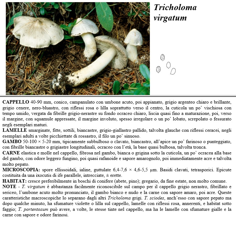 CAPPELLO 40-90 mm; conico, campanulato con umbone acuto, poi appianato, grigio argenteo chiaro e brillante, grigio cenere, nero-bluastro, con riflessi rosa o lilla soprattutto verso il centro, la cuticola un po' vischiosa con tempo umido, vergata da fibrille grigio-nerastre su fondo ocraceo chiaro, liscia quasi fino a maturazione, poi, verso il margine, con squamule appressate, il margine involuto, spesso irregolare o un po' lobato, screpolato o fessurato negli esemplari maturi. LAMELLE smarginate; fitte; sottili, biancastre, grigio-giallastro pallido; talvolta glauche con riflessi ceracei; negli esemplari adulti a volte picchiettate di rossastro, il filo un po' sinuoso. GAMBO 50-100 x 5-20 mm, tipicamente subbulboso o clavato, biancastro, all'apice un po' farinoso o punteggiato, con fibrille biancastre o grigiastre longitudinali, ocraceo con l'età; la base quasi bulbosa talvolta tronca. CARNE elastica e molle nel cappello; fibrosa nel gambo; bianca o grigina sotto la cuticola; un po' ocracea alla base del gambo, con odore leggero fungino, poi quasi rafanoide e sapore amarognolo, poi immediatamente acre e talvolta molto pepato. MICROSCOPIA spore ellissoidali; ialine, guttulate 6,4-7,6 x 4,6-5,5 µm. Basidi clavati, tetrasporici. Epicute costituita da una ixocutis di ife parallele; intrecciate, più o meno erette. HABITAT cresce preferibilmente in boschi di conifere (abete, pino); gregario, da fine estate, non molto comune. NOTE - T. virgatum è abbastanza facilmente riconoscibile sul campo per il cappello grigio nerastro, fibrillato e sericeo; l'umbone acuto molto pronunciato, il gambo bianco e nudo e la carne con sapore amaro; poi acre. Queste caratteristiche macroscopiche lo separano dagli altri Tricholoma grigi. T. sciodes, anch'esso con sapore pepato ma dopo qualche minuto, ha sfumature violette o lilla sul cappello, lamelle con riflessi rosa, annerenti, e habitat sotto faggio; T. portentosum può acere; a colte, le stesse tinte nel cappello, ma ha le lamelle con sfumature gialle e la carne con sapore e odore farinosi.