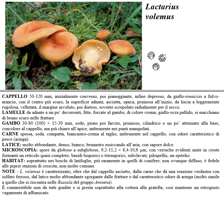 CAPPELLO 50-120 mm, inizialmente convesso, poi pianeggiante, infine depresso, da giallo-rossiccio a fulvo-arancio, con il centro più scuro, la superficie adnata, asciutta, opaca, pruinosa all'inizio, da liscia a leggermente rugolosa, vellutata, il margine involuto, poi disteso, sovente screpolato radialmente per il secco. LAMELLE da adnate a un po' decorrenti, fitte, forcate al gambo, di colore crema, giallo-ocra pallido, si macchiano di bruno scuro nelle fratture. GAMBO 30-80 (100) x 15-30 mm, sodo, pieno poi farcito, pruinoso, cilindrico o un po' attenuato alla base, concolore al cappello, ma più chiaro all'apice, imbrunente nei punti manipolati. CARNE spessa, soda, compatta, biancastro-crema al taglio, imbrunente nel cappello, con odore caratteristico di pesce (aringa). LATTICE molto abbondante, denso, bianco, brunastro essiccando all'aria, con sapore dolce. MICROSCOPIA spore da globose a subglobose, 9,2-11,2 x 5,4-10,6 µm, con verruche evidenti unite in creste formanti un reticolo quasi completo, basidi bisporici o tetrasporici, subvlacati, pileipellis, un epitelio. HABITAT soprattutto nei boschi di latifoglie, più raramente in quelli di conifere, non ovunque diffuso, è fedele alle prprie stazioni di crescita, non molto comune. NOTE - L. volemus è caratterizzato, oltre che dal cappello asciutto, dalla carne che dà una reazione verdastra con solfato ferroso, dal lattice molto abbondante sgorgante dalle fratture e dal caratteristico odore di aringa (molto simile a quello che si riscontra nelle Russula del gruppo Amoena). E commestibile non da tutti gradite e si presta soprattutto alla cottura alla gratella, così mantiene un retrogusto vagamente di affumicato.