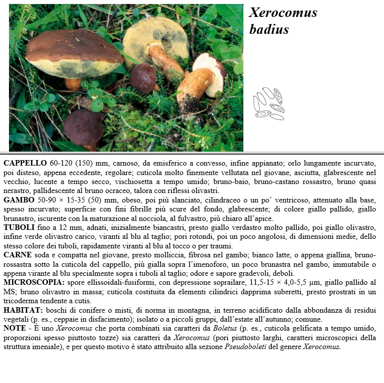 CAPPELLO 60-120 (150) mm, carnoso, da emisferico a convesso, infine appianato, orlo lungamente incuneato, poi disteso, appena eccedente, regolare, cuticola molto finemente vellutata nel giovane, asciutta, glabrescente nel vecchio, lucente a tempo secco, vischiosetta a tempo umido, bruno-baio, bruno-castano rossastro, bruno quasi nerastro, pallidescente al bruno ocraceo, talora con riflessi olivastri. GAMBO 50-90 x 15-35 (50) mm, obeso, poi più slanciato, cilindraceo o un po' centricoso, attenuato alla base, spesso incurvato, superficie con fini fibrille più scure del fondo, glabrescente, di colore giallo pallido, giallo brunastro, iscurente con la maturazione al nocciola, al fulvastro, più chiaro all'apice. TUBOLI fino a 12 mm, adnati, inizialmente biancastri, presto giallo verdastro molto pallido, poi giallo olivastro, infine verde olivastro carico, viranti al blu al taglio, pori rotondi, poi un poco angolosi, di dimensioni medie, dello stesso colore dei tuboli, rapidamente viranti al blu al tocco o per traumi. CARNE soda e compatta nel giovane, presto molliccia, fibrosa nel gambo, bianco latte, o appena giallina, bruno-rossastra sotto la cuticola del cappello, più gialla sopra l'imenoforo, un poco brunastra nel gambo, immutabile o appena virante al blu specialmente sopra i tuboli al taglio, odore e sapore gradevoli, deboli. MICROSCOPIA spore ellissoidali-fusiformi, con depressione soprailare, 11,5-15 x 4,0-5,5 µm, giallo pallido al MS, bruno olivastro in massa, cuticola costituita da elementi cilindrici dapprima suberetti, presto prostrati in un tricoderma tendente a cutis. HABITAT boschi di conifere o misti, di norma in montagna, in terreno acidificato dalla abbondanza di residui vegetali (p. es., ceppaie in disfacimento), isolato o a piccoli gruppi, dall'estate all'autunno, comune. NOTE - E uno Xerocomus che porta combinati sia caratteri da Boletus (p. es., cuticola gelificata a tempo umido, proporzioni spesso piuttosto tozze) sia caratteri da Xerocomus (pori piuttosto larghi, caratteri microscopici della struttura imeniale), e per questo motivo è stato attribuito alla sezione Pseudoboleti del genere Xerocomus
