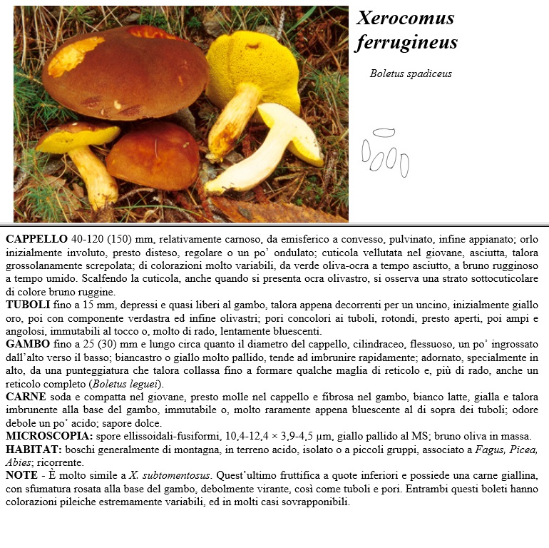 CAPPELLO 40-120 (150) mm, relativamente carnoso, da emisferico a convesso, pulvinato, infine appianato, orlo inizialmente involuto, presto disteso, regolare o un po' ondulato, cuticola vellutata nel giovane, asciutta, talora grossolanamente screpolata, di colorazioni molto cariabili, da verde oliva-ocra a tempo asciutto, a bruno rugginoso a tempo umido. Scalfendo la cuticola, anche quando si presenta ocra olivastro, si osserva una strato sottocuticolare di colore bruno ruggine. TUBOLI fino a 15 mm, depressi e quasi liberi al gambo, talora appena decorrenti per un uncino, inizialmente giallo oro, poi con componente verdastra ed infine olivastri, pori concolori ai tuboli, rotondi, presto aperti, poi ampi e anoolosi, immutabili al tocco o, molto di rado, lentamente bluescenti. GAMBO fino a 25 (30) mm e lungo circa quanto il diametro del cappello, cilindraceo, flessuoso, un po' ingrossato dall'alto verso il basso, biancastro o giallo molto pallido, tende ad imbrunire rapidamente, adornato, specialmente in alto, da una punteggiatura che talora collassa fino a formare qualche maglia di reticolo e, più di rado, anche un reticolo completo (Boletus leguei). CARNE soda e compatta nel giovane, presto molle nel cappello e fibrosa nel gambo, bianco latte, gialla e talora imbrunente alla base del gambo, immutabile o, molto raramente appena bluescente al di sopra dei tuboli, odore debole un po' acido, sapore dolce. MICROSCOPIA spore ellissoidali-fusiformi, 10,4-12,4 x 3,9-4,5 um, giallo pallido al MS, bruno oliva in massa. HABITAT boschi generalmente di montagna, in terreno acido, isolato o a piccoli gruppi, associato a Fagus, Picea, Abies, ricorrente. NOTE - E molto simile a X. subtomentosus. Quest'ultimo fruttifica a quote inferiori e possiede una carne giallina, con sfumatura rosata alla base del gambo, debolmente virante, così come tuboli e pori. Entrambi questi boleti hanno colorazioni pileiche estremamente variabili, ed in molti casi sovrapponibili.