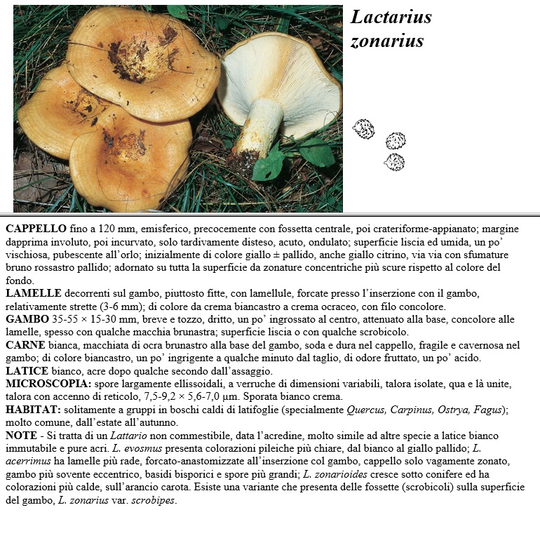 CAPPELLO fino a 120 mm, emisferico, precocemente con fossetta centrale, poi crateriforme-appianato, margine dapprima involuto, poi incurvato, solo tardivamente disteso, acuto, ondulato, superficie liscia ed umida, un po' vischiosa pubescente all'orlo, inizialmente di colore giallo più omeno pallido, anche giallo citrino, via via con sfumature bruno rossastro pallido, adornato su tutta la superficie da zonature concentriche più scure rispetto al colore del fondo. LAMELLE decorrenti sul gambo, piuttosto fitte, con lamellule, forcate presso l'inserzione con il gambo, relativamente strette (3-6 mm), di colore da crema biancastro a crema ocraceo, con filo concolore. GAMBO 35-55 x 15-30 mm, breve e tozzo, dritto, un po' ingrossato al centro, attenuato alla base, concolore alle lamelle, spesso con qualche macchia brunastra, superficie liscia o con qualche scrobicolo. CARNE bianca, macchiata di ocra brunastro alla base del gambo, soda e dura nel cappello, fragile e cavernosa nel gambo, di colore biancastro, un po' ingrigente a qualche minuto dal taglio, di odore fruttato, un po' acido. LATTICE bianco, acre dopo qualche secondo dall'assaggio. MICROSCOPIA spore largamente ellissoidali, a verruche di dimensioni variabili, talora isolate, qua e là unite, talora con accenno di reticolo, 7,5-9,2 x5,6-7,0 µm. Sporata bianco crema. HABITAT solitamente a gruppi in boschi caldi di latifoglie (specialmente Quercus, Carpinus, Osm a, Fagus), molto comune, dall'estate all'autunno. NOTE - Si tratta di un Lattario non commestibile, data l'acredine, molto simile ad altre specie a lattice bianco immutabile e pure acri. L. evosmus presenta colorazioni pileiche più chiare, dal bianco al giallo pallido, L. acerrimus ha lamelle più rade, forcato-anastomizzate all'inserzione col gambo, cappello solo vagamente zonato, gambo più sovente eccentrico, basidi bisporici e spore più grandi, L. zonarioides cresce sotto conifere ed ha colorazioni più calde, sull'arancio carota. Esiste una variante che presenta delle fossette (scrobicoli) sulla superficie del gambo, L. zonarius var. scrobipes.